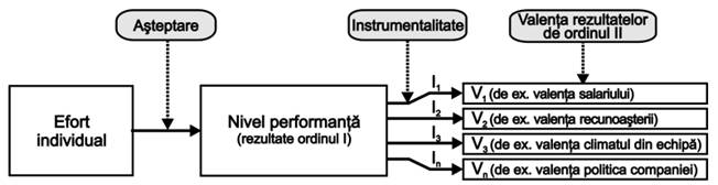 Teoria asteptarii este construita in jurul a trei elemente de baza (figura 7.): asteptarea (relatia efort-performanta), instrumentalitatea (relatia performanta-rezultat) si valenta (valoarea rezultatelor). Intensitatea ridicata a motivatiei va rezulta din combinarea celor trei componente, toate absolut necesare. Lipsa unui element (oricare dintre cele trei) va determina lipsa motivatiei. Cu alte cuvinte, pentru a fi motivat sa desfasoare o anumita activitate, omul trebuie sa valorizeze recompensa asociata, sa creada ca poate indeplini respectiva activitate si sa dispuna de indiciile potrivit carora performanta sa in activitate va fi rasplatita.