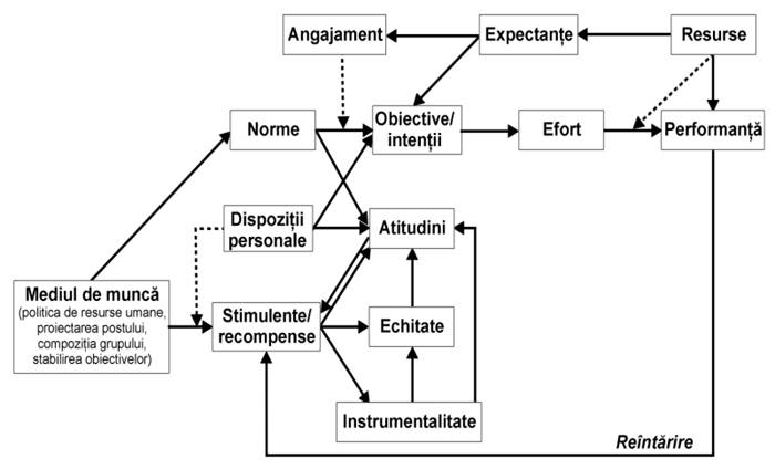 Katzell si Thompson au construit un model (figura 10.) care integreaza atitudinile, motivatia si performanta, care combina teoria nevoilor, teoria asteptarilor, importanta stabilirii obiectivelor si legatura inversa data de reintarire.