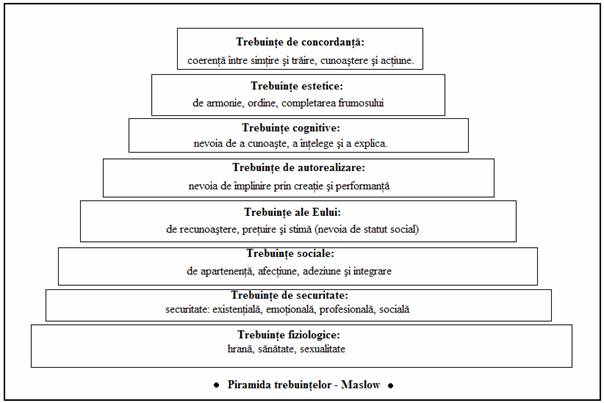 Dupa Maslow, aceste trebuinte se organizeaza intr-o ierarhie. Pana cand nu sunt satisfacute trebuintele asezate la nivelurile inferioare, cele superioare nu apar ca motivatie.