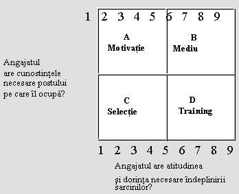 Patratul A (Motivatia): Daca angajatul este bine pregatit dar are o atitudine nepotrivita, poate fi vorba despre probleme motivationale. Vor trebui revazute consecintele (recompensele) comportamentului persoanei in cauza. Nu este neaparat un lucru rau. este posibil ca angajatul sa nu-si dea seama de consecintele actiunilor sale.