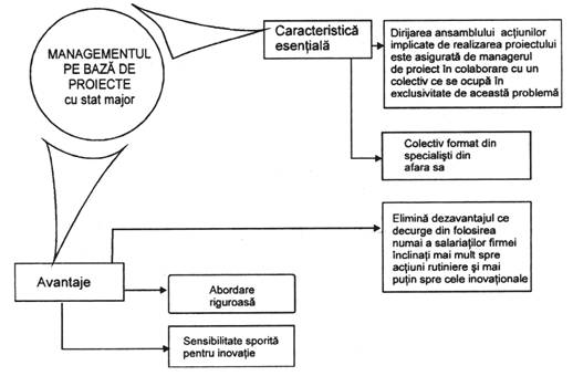 b. Management pe baza de proiecte cu stat major (fig. 3.3). In cazul acestei modalitati organizatorice dirijarea ansamblului actiunilor implicate de realizarea proiectului este asigurata de managerul de proiect, in colaborare cu un colectiv ce se ocupa in exclusivitate de aceasta problema. De retinut ca membrii colectivului efectueaza si o parte apreciabila din actiunile implicate de proiect. Pentru efectuarea celorlalte actiuni se apeleaza la ajutorul specialistilor din compartimentele firmei desemnati in prealabil de conducerea acesteia.