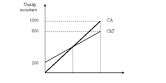 Exemplul 1. O intreprindere are o cifra de afaceri anuala de 1000 unitati monetare obtinuta din vanzarea a 100 produse la un pret mediu de 10 unitati monetare. Cheltuielile fixe anuale se ridica la valoarea de 200 unitati monetare iar cheltuielile variabile sunt de 600 unitati monetare/an. Sa se determine profitul anual al intreprinderii si volumul minim al productiei necesar pentru ca intreprinderea sa functioneze in conditii de rentabilitate.