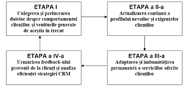 Managementul relatiilor cu clientii poate fi definit si ca un proces iterativ ce se deruleaza in 4 etape si care se bazeaza pe dezvoltarea in timp a relatiilor cu clientii