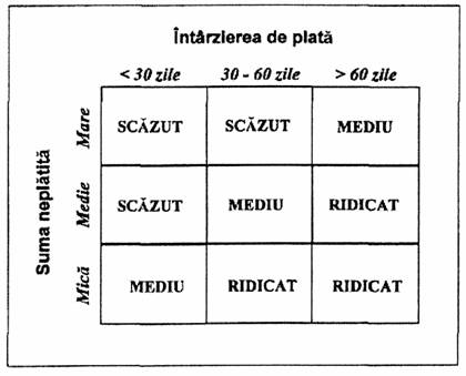 in ceea ce priveste managementul creditelor acordate clientilor, oricarei firme i se poate intampla ca o parte din clienti sa nu plateasca la timp facturile care le-au fost emise, intr-o perioada de stabilitate economica, reusita se masoara printr-o crestere a numarului de clienti ai firmei, a cifrei de afaceri si profitului. in spatele acestei cresteri exista un risc financiar, deoarece cu cat numarul clientilor creste, cu atat creste si numarul de credite acordate acestora (in cazul in care clientii nu sunt obligati sa plateasca "cash'). intr-o perioada de crestere puternica, acest risc este redus, dar se stie ca o firma "solida' intr-o perioada de timp din punct de vedere financiar poate cunoaste peste cateva luni o perioada de recesiune si astfel unii clienti nu vor reusi sa plateasca la termenul convenit.