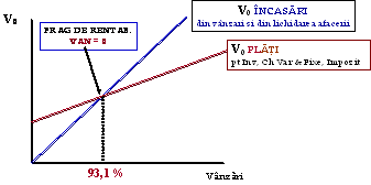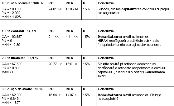 Asadar, marja de libertate pentru managementul intreprinderii se reduce considerabil, intre 100%, cat a fost apreciat ca activitate normala la inceput, la numai 93,1%. La acest nivel de activitate se reuseste recuperarea valorii initiale a capitalurilor actionarilor (VAN = 0):