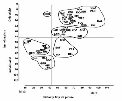 Pozitionarea tarilor dupa individualism versus colectivism si distanta fata de putere