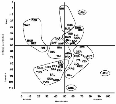 Sursa: Hofstede, Geert - "The position of the 40 countries on the uncertainty avoidance and masculinity scales", Culture s Consequences, Bervely Hills, CA Sage, 1980