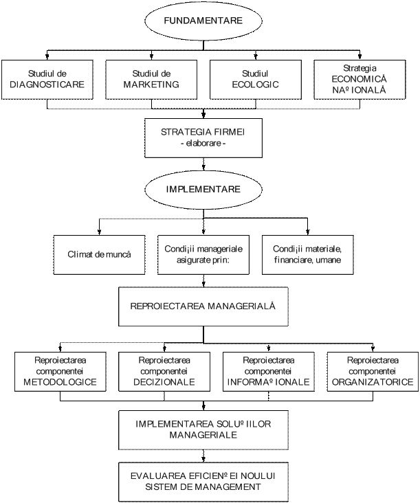 Reproiectarea manageriala este, concomitent, o conditie a aplicarii eficiente si eficace a strategiei si o consecinta a implementarii sale. O strategie de organizatie poate fi foarte bine fundamentata si excelent elaborata (in sensul de respectare intocmai a scenariului metodologic recomandat de stiinta managementului), dar sa nu poata fi operationalizata la adevarata sa dimensiune din cauza mediului aplicativ mai putin pregatit sa accepte schimbarea.