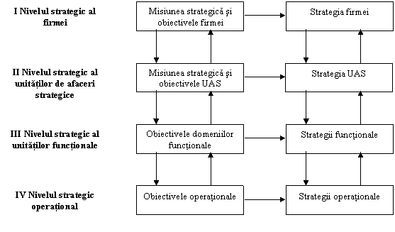 Obiectivele se esaloneaza pe nivelurile firmei, unitatilor de afaceri strategice ale acesteia, domeniilor functionale si operatiunilor, la aceste niveluri fiind stabilite si aplicate strategii cu sfera corespunzatoare de cuprindere.