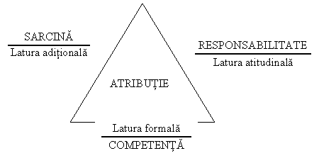 Atributia este componenta activitatii care incumba responsabilitate, necesita competenta si este data de ansamblul de sarcini identice sau omogene ce permit realizarea unor obiective specifice. Definitia evidentiaza ca atributia are trei laturi: actionala, atitudinala si formala (sau profesionala) care se concretizeaza in sarcinile ce trebuie indeplinite, responsabilitatile pe care incumba si competentele necesare. Cele trei laturi ale atributiei alcatuiesc ceea ce este cunoscut sub denumirea de "triunghi de aur" al organizarii si este prezentat in figura 1.2.