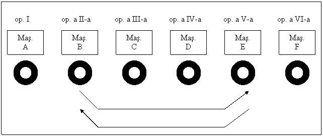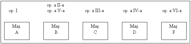 Operatia I se executa pe masina A, operatia a II-a pe masina B, operatia a III-a pe masina C, operatia a IV-a pe masina D, operatia a V-a pe masina E, iar operatia a VI-a pe masina F.