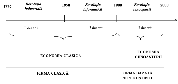 In perioada actuala se discuta tot mai insistent de o revolutie a cunoasterii sau o revolutie informationala, ca o trecere insesizabila de la o economie bazata pe resurse materiale la o economie bazata pe cunostinte; in centrul acestei revolutii informationale se localizeaza Internetul si retelele de computere, cu toate implicatiile socio-economice induse de aceasta componenta tehnica; acest ultim tip de economie s-a impus sub sintagma economia cunoasterii. "Adevaratul impact al revolutiei informationale, spune Drucker, abia incepe sa de faca simtit"; insa nu informatiile sau computerul se afla la originea acestei revolutii, ci fenomenul Internetului si comertul electronic, care a devenit mijlocul principal de distributie a marfurilor, locurilor de munca si managerilor; acest fenomen modifica profund economiile, pietele, structurile industriale, distributia bunurilor, comportamentul consumatorilor, categoriile de valori si piata muncii.