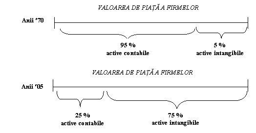 o Valoarea de piata a unei firme/intreprinderi este data predominant de activele ei intangibile si mai putin de componenta ei materiala, respectiv valoarea firmei este data de cunostintele, ideile si informatiile pe care le detin salariatii din organizatie; salariatii devin principalul activ al firmei, intrucat numai ei pot sa procure si sa proceseze cunostintele; conform unui studiu despre economia SUA si valoarea contabila a firmelor din aceasta tara, rezulta ca in anii ¢70 activele tangibile/contabile detineau circa 95% in valoarea de piata a firmelor, iar in prezent acest procent a scazut la 25%; ideea invocata se sugereaza grafic astfel:
