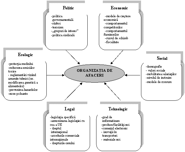 Conform cu Huczynski si Buchanan, anumite cunostinte/informatii cu privire la mediul extern al firmei pot sa fie obtinute prin recurgerea la Modelul PESTLE , ca un instrument de scanare a mediului extern si de identificare a factorilor principali cu influenta asupra evolutiei viitoare a firmei; este vorba de identificarea factorilor politici, economici, sociali, tehnologici, legali si ecologici care afecteaza organizatia (in engleza: Political, Economic, Social, Technological, Legal, Ecological ) . Figura ce urmeaza include variabilele care influenteaza compania in ansamblul sau, respectiv factorii grupasi dupa Modelul PESTLE; totusi, simpla informare asupra conditiilor de mediu nu este suficienta, fiind necesara analiza, sinteza si in final la elaborarea de decizii in domeniul general al afacerii(se enunta misiunea organizatiei si se schiteaza strategiile majore ce vor fi avute in vedere).