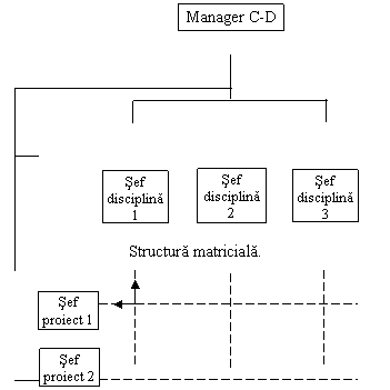 3. Structura matriciala are la baza separarea activitatilor stiintifice de cercetare, de cele manageriale. In cadrul acestei structuri, cercetatorul are dubla subordonare: fata de seful de proiect si fata de coordonatorul de disciplina stiintifica.