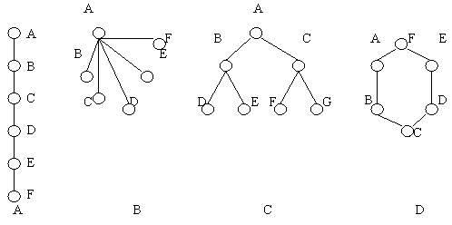 - retea de tip cerc - in care informatiile circula succesiv de la un membru la altul al grupului, reintorcandu-se la initiatorul ei (fig 5.12 D).