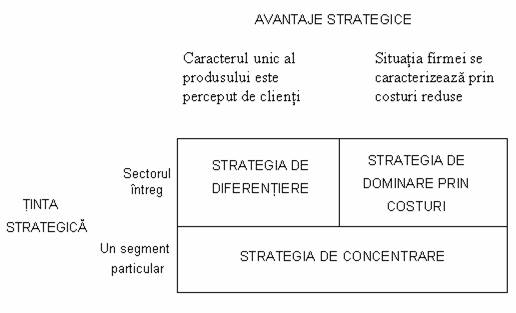 Definiti strategiile de baza in fata concurentei ale lui M. Porter si prezentati caracteristicile lor principale. Dati exemple de firme din Romania care se disting prin costuri sau diferentiere. Ce credeti, au avut aceste firme o strategie explicita? Cum explicati succesul multor firme din Romania, dupa anii '90, in absenta unei strategii? Se va mai putea face performanta fara strategie?