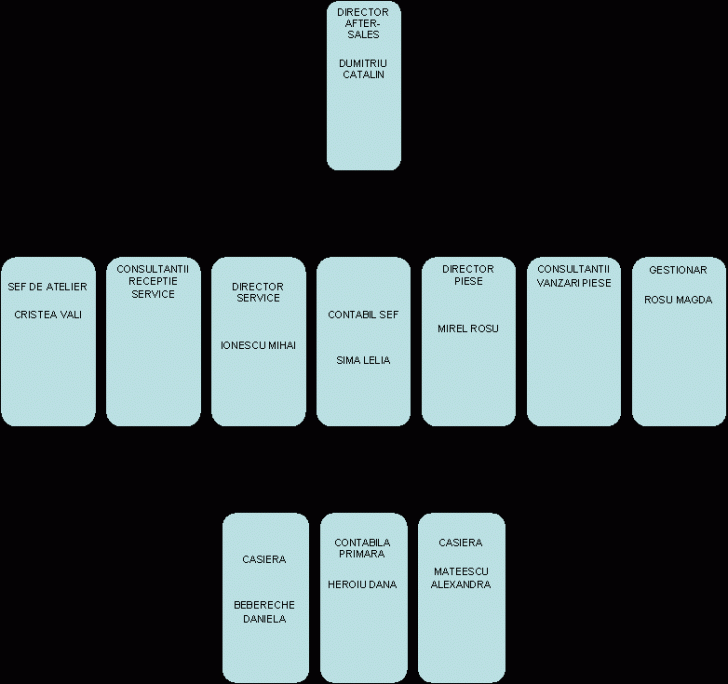 Departamentul receptie service si reparatii service,unde prgramul de lucru se desfasoara in doua ture, prima tura de la 8:00-15:00 iar cea de-a doua tura de la 15:00-22:00.Ca director general il avem pe Dumitriu Catalin.La receptie sunt zece consultanti.Ei fac programarile clientilor la revizii,cand clientul vine cu masina consultantul receptie service ii preia masina o verifica la prima vedere sii ii deschide clientului o comanda,mai apoi cosultantul preda masina atelierului de reparatii unde avem doi sefi de atelier Cristea Vali respectiv Alexandrescu Daniel,maistru atelier Tudor Marian si 16 mecanici/electricieni .