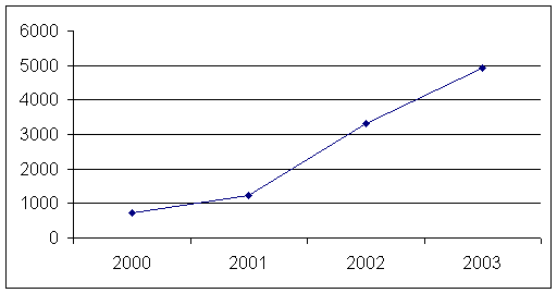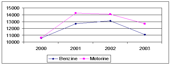 Figura 7. Evolutia vanzarilor de benzine si motorine in perioada 2000-2003 (din punct de vedere cantitativ)