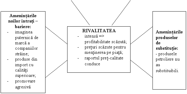 In ceea ce priveste produsele de substitutie, acestea nu exista la produsele petroliere. Astfel, pentru mentinerea pe piata si castigarea de noi segmente de piata va fi necesara adoptarea in continuare a aplicarii strategiei preturilor reduse.