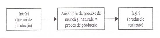 Procesul de productie se defineste ca fiind totalitatea actiunilor constiente ale angajatilor firmei indreptate asupra obiectelor muncii in vederea transformarii acestora in bunuri materiale, necesare societatii. Continutul principal al oricarui proces de productie este procesul de munca, definit drept actiunea executantilor desfasurata cu ajutorul uneltelor de munca asupra obiectelor muncii, in vederea transformarii acestora in bunuri materiale. In unele ramuri industriale, pe langa procesele de munca,procesele de productie necesita si existenta unor procese naturale in cadrul carora obiectele muncii sunt supuse unor transformari fizice sau chimice sub actiunea factorilor naturali, fara implicarea partiala sau totalaa proceselor de munca. Din punct de vedere tehnico-material, procesul de productie cuprinde ansamblul proceselor de munca si proceselor naturale, in interdependenta lor reciproca ce conlucreaza la obtinerea produselor care constituie obiectul activitatii firmei. Procesul de productie este componenta de baza a oricarui sistem de productie, care conform Fig. 2.1. are urmatoarea structura: