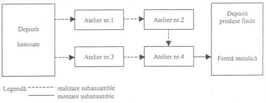tipul tehnologic, caracterizat printr-o organizare a sectiilor productive de baza dupa principiul tehnologic. Se recomanda firmelor cu productivitate individuala sau de serie mica si are urmatoarele avantaje: permite o nomenclatura variata de produse, asigura folosirea rationala (incarcare aproape completa) a masinilor si utilajelor si creeaza conditii pentru folosirea completa a fortei de munca. Ca dezavantaje putem mentiona: volumul sporit de transporturi interne, intreruperi mari in functionarea utilajelor (timpi morti), reducerea raspunderii pentru calitatea reperelor executate si lipsa unei productii de flux continuu (Fig. 2.6.).