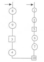 Gradul de analiza generala, care arata succesiunea executarii operatiilor si a timpului de executie in procesul de productie. In reprezentarea grafica, se trece in interiorul simbolului cifra de ordine corespunzatoare, din succesiunea regasita in proces, iar in stanga simbolului se indica timpul de executie (sau alte date). In cazul proceselor complexe, caracterizate prin faptul ca in procesul principal se aduc noi materiale, repere sau subansamble prelucrate, reprezentate prin linii orizontale care le alimenteaza pe cele verticale, numerotarea operatiilor ce se efectueaza asupra acestora se face in continuare fata de punctul in care atinge procesul principal (Fig. 2.4.).