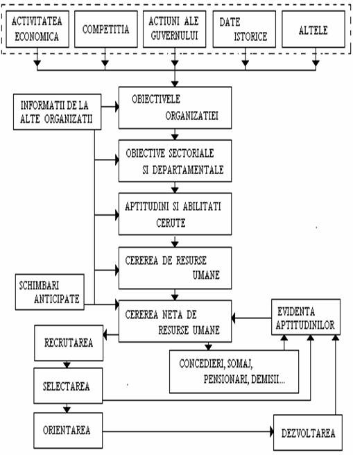 Determinarea nevoilor de resurse umane ale organizatiei este obiectivul principal al procesului de planificare de resurse umane. Cele doua componente majore ale procesului sunt determinarea ofertei si determinarea cererii de resurse umane. Procesul este orientat de obiectivele si planurile strategic, tactic si operational ale organizatiei. Alocarea lucratorilor pe diferite posturi (conform analizei si descrierii postului) impune cunoasterea expansiunii sau reducerii volumului de activitate sau a schimbarilor la nivel economic sau tehnologic ce vor afecta organizatia. Pe baza analizei informatiilor de tipul celor de mai sus, se poate planifica "glisarea" lucratorilor de pe o pozitie pe alta, reducerea sau cresterea numarului de posturi si implicit de angajati sau reinstruirea fortei de munca existente. Factorii ce trebuie avuti in vedere sunt nivelul cunostintelor, profesionalismului si abilitatilor lucratorilor si, posturile potential vacante in urma pensionarilor, promovarilor, transferurilor sau demisiilor.