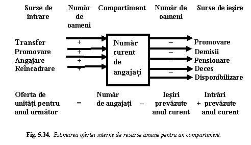 Oferta interna. Disponibilul de resurse umane existent in interiorul organizatiei depinde in principal, de programele de instruire si dezvoltare, politicile de promovare si transfer, si de politicile de pensionare. Figura 5.34 arata in termeni generali, cum se poate determina oferta interna.