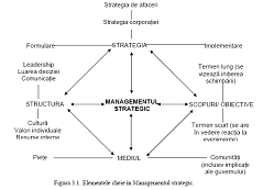 Ceea ce se prezinta in figura de mai sus constituie un model de lucru simplificat privind managementul strategic, prin care se incearca sa se evidentieze unele aspecte principale implicate fara a contine si complexitatea care acompaniaza astfel de subiecte in textele consacrate. Sunt insa necesare cateva observatii. In primul rand, este separata strategia de scopuri/obiective, cu alte cuvinte strategia este considerata ca un proces separat de procesul definirii obiectivelor. Trebuie spus ca foarte multi teoreticieni nu sunt de acord cu acest punct de vedere, ei preferand sa incorporeze definirea scopurilor si obiectivelor ca fiind parte integranta a procesului de dezvoltare a strategiei. De asemenea, in figura este prezentata planificarea strategica ca fiind de tip multinivel, adica exista nivelul strategiei de corporatie dar si un nivel separat de strategie de afaceri. In al doilea rand, este sugerat faptul ca scopurile si obiectivele nu sunt stabilite doar pe termen lung, dar si pe termen scurt ca raspuns la schimbarile in mediul de operare al organizatiei. In al treilea rand, un aspect cheie al managementului strategic il constituie dezvoltarea unei structuri viabile de leadership si luare a deciziei, pentru a promova si sustine implementarea strategiei. Aceasta notiune de structura implica aplicarea valorilor