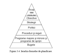 Planificarea se refera la orice directie sau orientare de actiune viitoare. Formele de planificare sunt variate si pot fi ordonate piramidal: scopuri sau misiuni, obiective, strategii, politici, proceduri, reguli, programe, bugete. In figura 4 este reprezentata ierarhia acestor forme de planificare.