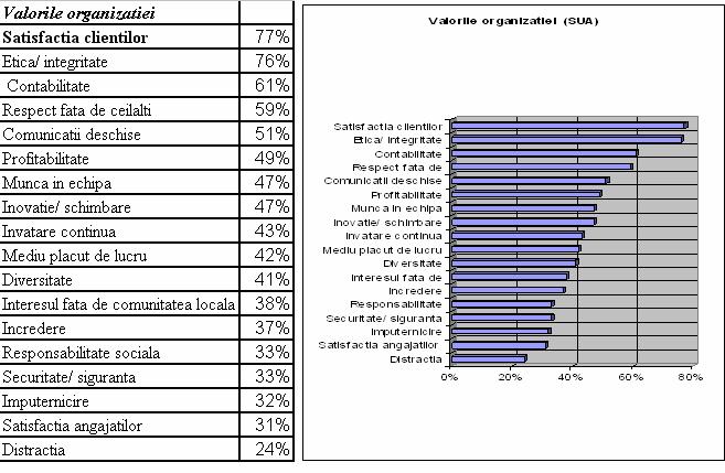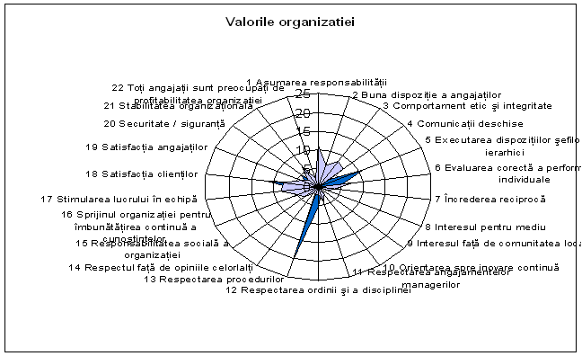 Analizand informatiile obtinute constatam ca valorile promovate de organizatie sunt recunoscute si impartasite de angajati.
