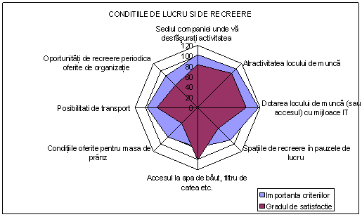 Analizand graficul observam ca respondentii acorda importanta conditiilor de lucru si de recreere, fiind satisfacuti de accesul la apa de baut, la filtrul de cafea si de dotarea locului de munca cu mijloace IT.