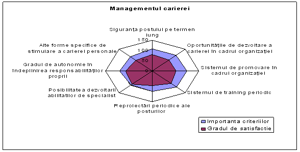 Pentru angajatii unitatii analizate, siguranta postului pe termen lung, oportunitatile de dezvoltare a carierei in cadrul organizatiei si sistemul de promovare sunt criterii la care angajatii acorda o mai mare importanta, dar satisfactia este data de posibilitatea dezvoltarii abilitatilor de specialist.