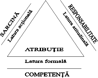 Aceste laturi se concretizeaza in sarcinile ce trebuiesc indeplinite, responsabilitatile pe care le incumba si competentele necesare. Cele trei laturi ale atributiei alcatuiesc ceea ce este cunoscut sub denumirea de "triunghi de aur" al organizarii si este prezentat in fig.nr.1.4.