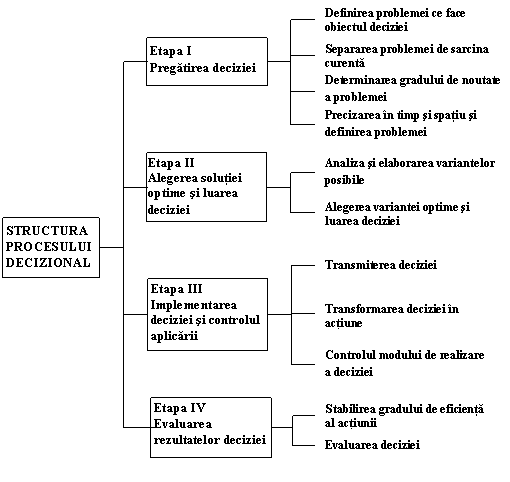 Procesul decizional (Figura 1.) se desfasoara pe parcursul a mai multor etape si faze, iar structura procesului decizional rezulta din numarul si ordinea de succesiune a etapelor. Procesul decizional se desfasoara pe parcursul a trei etape principale, fiecare etapa cuprinzand mai multe faze: