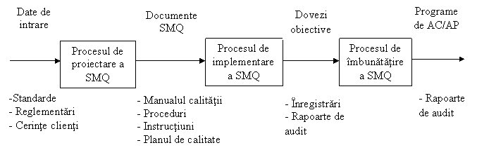 Standardul international ISO 9001: 2000 promoveaza adoptarea abordarii prin proces īn proiectarea, implementarea si īmbunatatirea SMQ. Avantajul abordarii prin procese este controlul permanent pe care acesta īl asigura asupra fiecarui proces īn parte precum si asupra īntregului sistem. Īn SMQ contine patru mari grupe de cerinte specifice a patru mari procese prezentate īn figura urmatoare.