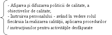 5. Responsabilitatea managementului 5.1. Angajamentul managementului 5.2. Orientarea catre client 5.3. Politica referitoare la calitate 5.4. Planificare 5.5. Responsabilitate, autoritate si comunicare 5.6. Analiza efectuata de management 6. Managementul resurselor 6.1. Asigurarea resurselor 6.2. Resurse umane 6.3. Infrastructura 6.4. Mediu de lucru |
