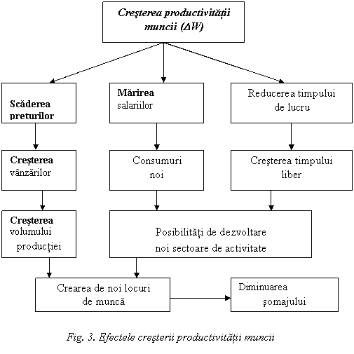 a) Productivitatea muncii este factorul determinant si reprezentativ al nivelului de dezvoltare tehnica, tehnologica, economica si organizatorica, a sistemului de productie, exprima cel mai sintetic si concludent rodnicia muncii tuturor lucratorilor si a fiecaruia in parte. In nivelul productivitatii muncii isi gaseste materializarea gradul de modernizare al utilajelor, eficienta cu care sunt folosite de om in procesul de productie, nivelul de calificare al fortei de munca, nivelul de organizare si disciplina a productiei si a muncii. Necesitatea cresterii productivitatii muncii in fiecare sistem de productie nu mai trebuie demonstrata. Efectele cresterii productivitatii muncii sunt utile si importante atat pentru intreprindere cat si pentru economia nationala. Acest lucru rezulta si din schema prezentata in figura 3.
