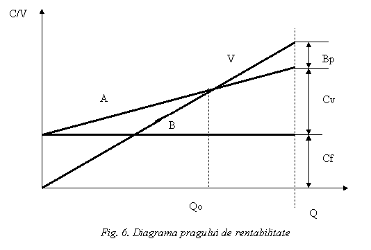 comporta exact invers, respectiv cele conventional-constante sunt descrescatoare iar cele variabile sunt constante pe unitatea de produs. Functia veniturilor este o drepata care trece prin origine (y = ax). Graficele suprapuse ale celor doua functii (costuri si venituri) sunt reprezentate in figura 6, din care rezulta urmatoarele: