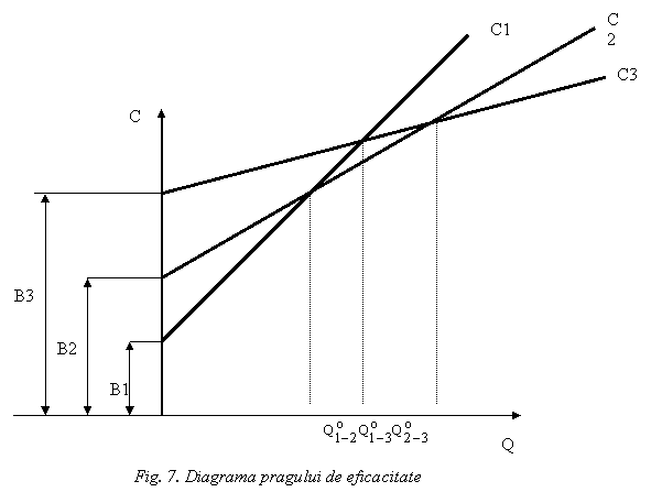b) Diagrama pragului de eficacitate se utilizeaza in cazul existentei mai multor variante de decizie care sunt comparate dupa indicatorul costul volumului anual de productie sau costul unitar. Daca pentru un proiect - de exemplu retehnologizarea unei sectii - sunt trei solutii, functiile costurilor sunt: