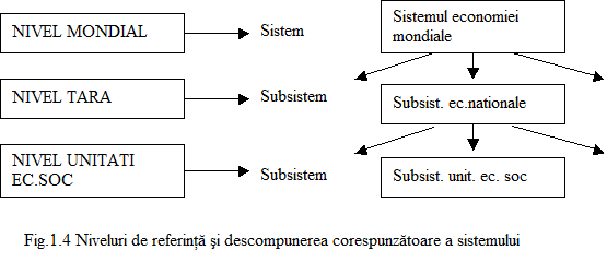 In ceea ce priveste raportul dintre nivelul de referinta si descompunerea sistemului pe subsisteme, spre exemplificare, am putea privi economia mondiala ca fiind formata din economia multitudinii tarilor, care la randul lor include multitudinea unitatilor economico-sociale din fiecare tara (fig.1.4).