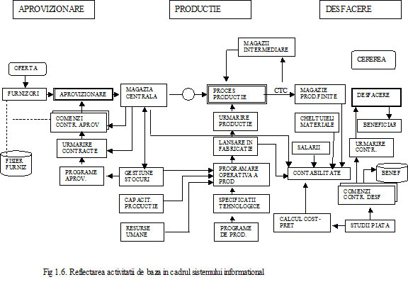 Sistemul informational poate fi privit ca "umbra" proceselor si fenomenelor ce se petrec in cadrul unei unitati economico-sociale asa dupa cum reiese si din figura 1.6. In partea superioara a figurii 1.6 sunt redate intr-o succesiune logica activitatile de baza si procesele ce au loc intr-o societate comerciala cu caracter productiv: aprovizionare, productie si desfacere. In partea inferioara (marcata prin linie intrerupta) se constata, consemneaza, reflecta si informeaza tot ceea ce se petrece pe parcursul fluxului aprovizionare - productie - desfacere.