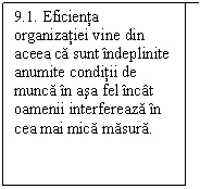 A) Pana la care punct si in ce maniera se implica managerul, personal, in executarea muncii pe care o administreaza? B) Pana la care punct este managerul exigent fata de subordonatii sai si ce anume conditioneaza atingerea nivelului respectiv? C) Pana la care punct managerul determina implicarea si responsabilizarea subordonatilor sai prin facilitarea accesului la informatii, prin consultanta si prin delegarea de competente? D) Pana la care punct managerul este orientat spre aspectele formale, in defavoarea aspectelor de fond, in ceea ce priveste consideratia acordata propriilor subordonati? E) Pana la care punct managerul rezista presiunilor interne care sunt determinate de subordonatii sai, in opozitie cu nivelul presiunilor externe impuse de mediul exterior si de obiectivele organizatiei? F) Pana la care punct managerul plaseaza supravegherea generala a personalului si controleaza functionalitatea sistemului bazat pe prudenta, mai presus decat supravegherea bazata pe neincredere? G) Pana la care punct managerul valorifica o structura mai degraba rigida si birocratica, in opozitie cu o structura supla, usor de modelat, centrata pe clienti si pe angajati? H) Pana la care punct managerul respecta functiile intermediare carora le sunt atribuite roluri si responsabilitati, in opozitie cu practica de ,,by-pass", sub pretextul ca acest mod de lucru este mai suplu si evita tarele birocratiei? |