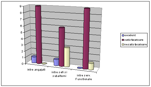 Printre lucrurile care le plac cel mai mult angajatilor in privinta organizatiei se numara reltiile profesionale dintre colegi, munca in echipa, mediul placut de lucru in care se desfpsoara activitatea firmei, faptul ca plata salariului se face la timp. Altora le place faptul ca in organizatie exita putine conflicte, de unde rezulta buna intelegere intre colegi si sporirea performantelor organizatiei. Dintre lucrurile care le displac angajatilor cel mai frecvent apare motivatia scazuta pentru munca.