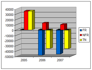 In 2005 si 2006 CAF are valori negative,de unde reiese ca intreprinderea analizata inregistreaza plati mai mari decat incasari si a obtinut pierdere in acest an . Firma nu dispune de mijloace financiare necesare activitatii de mentinere a potentialului activitate comerciala si nici pentru activitatea de expansiune- efectuarea de investitii.Rezulta ca in exercitiul urmator intreprinderea va fi nevoita sa contracteze credite , actiune care va duce inevitabil la cresterea cheltuielelor financiare a unitatii.