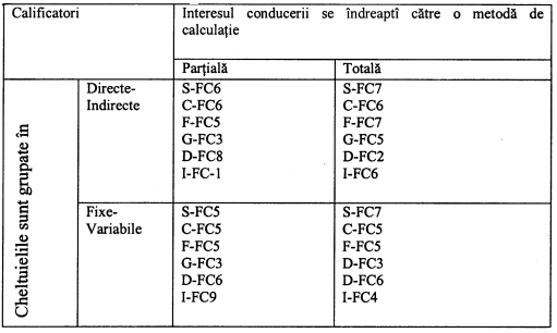 a) in ce priveste clasificarea metodelor de calculatie a costurilor, literatura in domeniu prezinta o varietate de criterii de clasificare. Totusi se considera ca pentru aceasta demonstratie criteriul edificator la clasificarea metodelor de calculatie il constitute modul de cuprindere in costul final a tuturor elementelor de cheltuieli si a articolelor de calculatie. Astfel, vom avea doua categoric de metode de calculatie a costurilor: totale si partiale. Conform Regulamentului de aplicare a Legii 82/1991, in categoria metodelor totale se includ: metoda standard cost, metoda pe comenzi, metoda pe faze si metoda globala, car in categoria metodelor partiale se incadreaza metoda direct - costing si metoda costurilor directe.