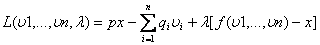 unde p este pretul outputului iar q sunt preturile inputurilor considerate a fi constante pe piata.Lagrangianul asociat acestei probleme este: