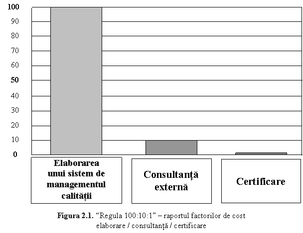 Regula arata ca, in principiu, nivelul cheltuielilor interne pentru implementarea si mentinerea sistemului de managementul calitatii poate fi asociat cu cifra 100. La aceeasi scara valorica, cheltuielile cu serviciile de consultanta externa, li se poate atribui cifra 10. In fine, pentru nivelul cheltuielilor pentru certificarea propriu-zisa, se poate asocia cifra 1, care reprezinta prin urmare doar o mica parte a costurilor totale