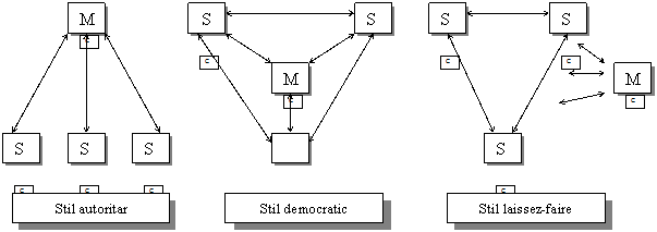 Din perspectiva relatiilor interpersonale, cele trei stiluri de leadership pot fi ilustrate conform graficelor din fig. 6.3. Managerul se poate situa pe trei pozitii: prima caracterizata prin dominanta, a doua de cooperare, iar ultima, laterala, total neimplicata in rezolvarea sarcinilor grupului.